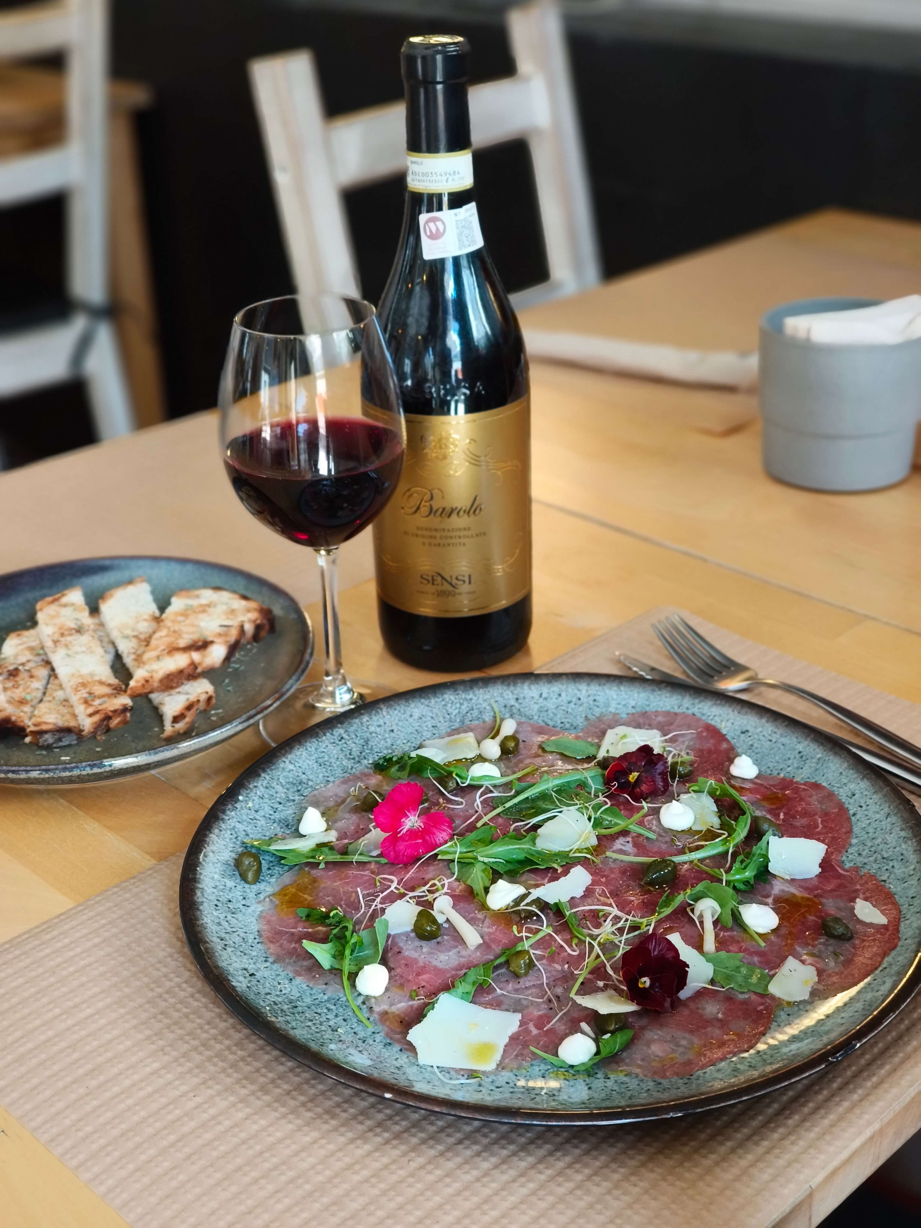 Beef carpaccio, arugula, sun-dried tomatoes, parmesan shavings, capers, black pepper, aromatic mayonnaise, lemon juice, olive oil, sprouts - rustic bread